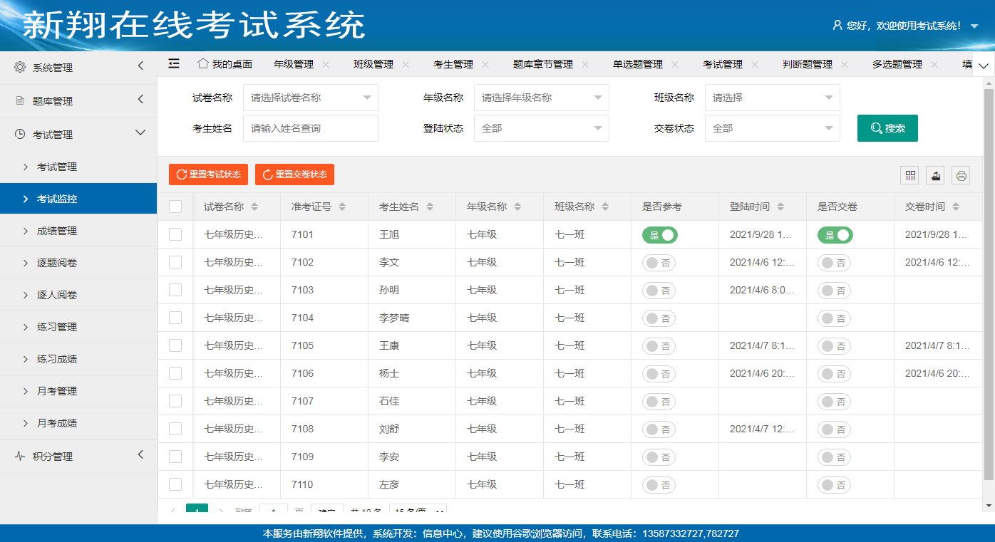 5、考試監(jiān)控可查看學(xué)生登錄及交卷情況。