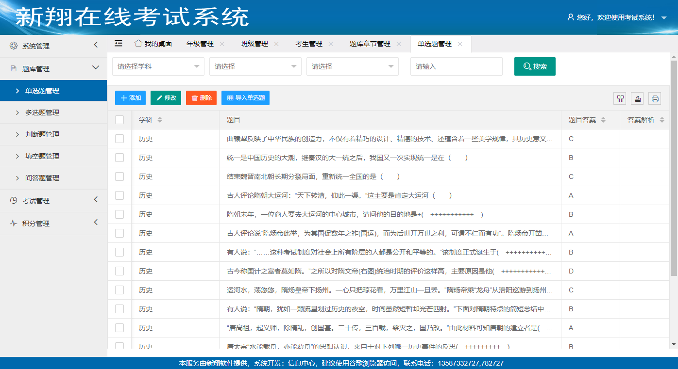 3、題庫管理功能:可增加或?qū)雴芜x、多選、判斷、填空、問答等各種題型。