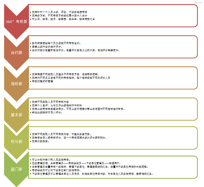 1、系統(tǒng)同時支持KPI關(guān)鍵指標和360°考核的需求;